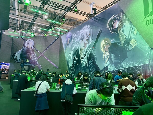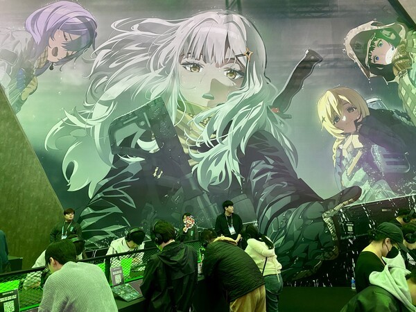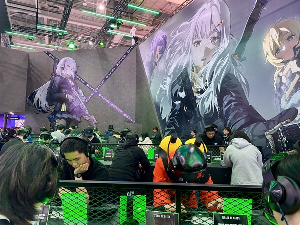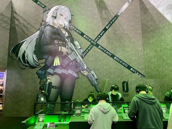 '게이트 오브 게이츠' 체험 부스는 미소녀 캐릭터를 벽면에 배치해, 신작의 대한 호기심을 높였다. 이 게임은 전략에 따라 다양한 전투를 구현할 수 있다.