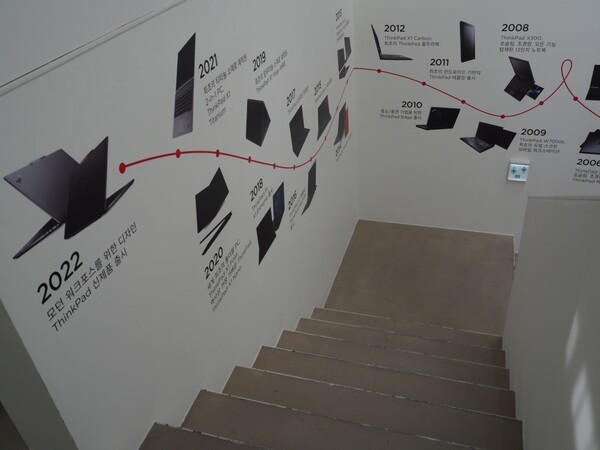 2층으로 향하는 계단 벽면에는 레노버가 1984년 창립한 이후 40년간 이어오면서 출시한 다양한 제품 중 씽크패드의 헤리티지를 만날 수 있는 공간으로 구성했다.
