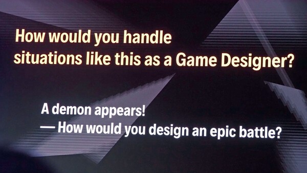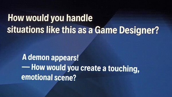 이에 요코는 “액션은 잘하지 못하니 카미야 씨에게 바통터치하고, 나는 시나리오 쪽으로 생각해 보겠다. 예를 들어 게임에서는 단순히 보스를 쾅 하고 배치하는 게 아니라, 플레이어가 쓰러뜨리고 싶어 하는 이유를 만드는 게 중요하다”라고 말했다.