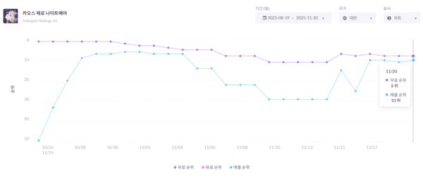 한편, 지난 11월 10일 적용된 시즌1 ‘금기의 카탈리스트’는 아직 국내에서 뚜렷한 성과를 보여주지는 못했지만, 대만 시장에서는 업데이트 이후 매출 순위 10위로 반등에 성공하며 기대 이상의 흐름을 보였다. 싱가포르 지역에서도 좋은 성적을 보이고 있으며, 이는 게임성 자체에 대한 신뢰가 서서히 쌓이고 있음을 보여주는 지표로 평가된다.