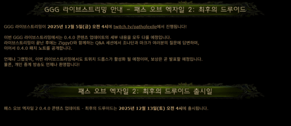 카카오게임즈와 게임의 개발사인 그라인딩 기어 게임즈는 콘텐츠 업데이트에 앞서 게임의 세부 업데이트 내용을 공유하는 'GGG 라이브 스트리밍'을 진행한다. 한국 시간으로 업데이트 일주일 전인 12월 5일 오전 4시에 진행되며 해당 세션에서는 개발진이 직접 내서 새로운 콘텐츠를 소개하고 유저들과의 질의응답을 진행할 계획이다.